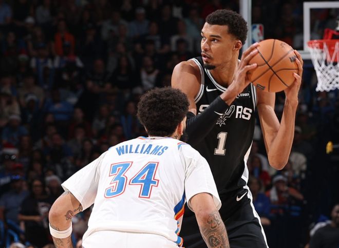 馬刺正在用表現(xiàn)證明,他們或許就是目前聯(lián)盟中最好的球隊(duì)。他們已經(jīng)連續(xù)兩場(chǎng)大勝雷霆,兩場(chǎng)比賽都早早進(jìn)入垃圾時(shí)間,一場(chǎng)在主場(chǎng),一場(chǎng)在俄克拉荷馬城的客場(chǎng)。他們擁有三名能在48分鐘內(nèi)有效組織進(jìn)攻的后衛(wèi),而這三人甚至都不是球隊(duì)的最佳球員。剛從小腿傷勢(shì)中復(fù)出的文班亞馬仍受出場(chǎng)時(shí)間限制,距離最佳狀態(tài)更是相去甚遠(yuǎn)。