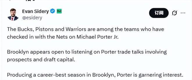 北京時(shí)間12月27日,據(jù)名記Sidery報(bào)道,勇士已經(jīng)就小邁克爾-波特的交易事宜,向籃網(wǎng)進(jìn)行過詢價(jià)。雄鹿和活塞也曾與籃網(wǎng)有過相關(guān)接觸?;@網(wǎng)方面似乎愿意聽取關(guān)于波特的交易報(bào)價(jià),尤其傾向于包含潛力球員和選秀權(quán)的方案。