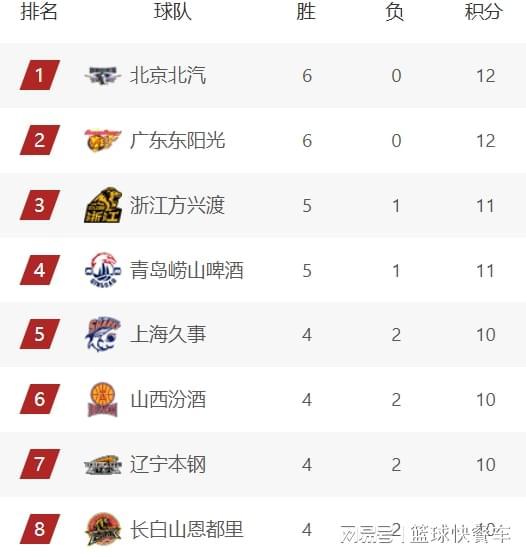 CBA常規(guī)賽第6輪全部戰(zhàn)罷,廣東、北京、山西以及新疆等隊悉數(shù)出戰(zhàn),北京隊和廣東隊繼續(xù)高歌猛進,分別戰(zhàn)勝新疆隊和山東隊,豪取6連勝。衛(wèi)冕冠軍廣廈緊隨其后,排在積分榜第三位,而青島這一輪掀翻山西隊以后,他們也成功殺進積分榜前四。由于北京、廣東以及青島等隊相繼贏球,四冠王遼寧隊排名直線下滑,從積分榜前四名,直接下滑到積分榜第7名。