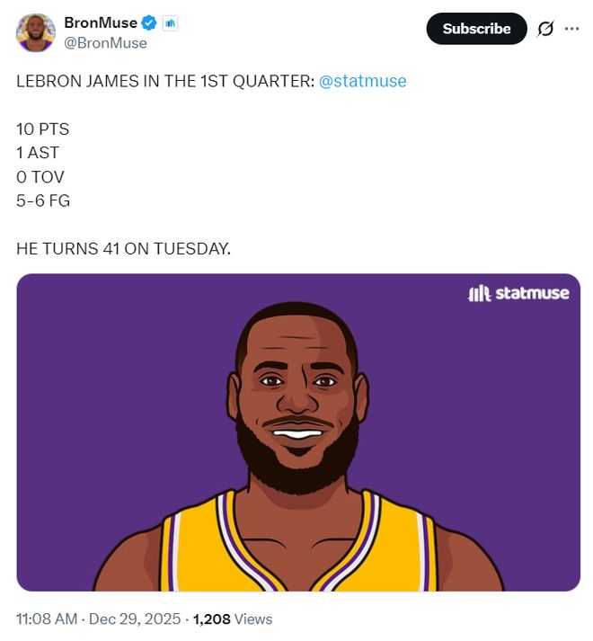 還差兩天就要年滿41歲,老同志開場連續(xù)的突破漲分,打了6分鐘拿到6分被換下休息。老同志的身體狀態(tài)是真的不錯,登場后命中了兩個高位的中投,單節(jié)8分鐘6中5,拿到10分1助攻,勒布朗首節(jié)已經(jīng)上雙了。