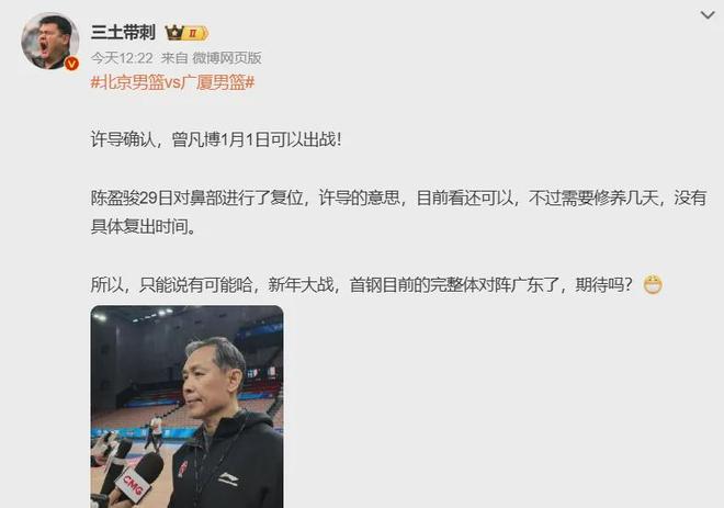 幾乎與此同時,北京隊主帥許利民確認(rèn)曾凡博會出戰(zhàn)北京時間2026年1月1日北京隊主場VS廣東隊的新年大戰(zhàn),這是他的本賽季首秀。