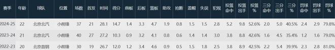 上賽季征戰(zhàn)CBA的曾凡博,常規(guī)賽出戰(zhàn)37場首發(fā)21次,場均亮相28.1分鐘貢獻(xiàn)14.7分4.7板1.9助1.5帽,兩項(xiàng)命中率52.6%與40.5%;季后賽出戰(zhàn)5場首發(fā)1次,場均亮相28.8分鐘,砍下15分4.2板1助1斷1.6帽,兩項(xiàng)命中率56.3%與43.3%。