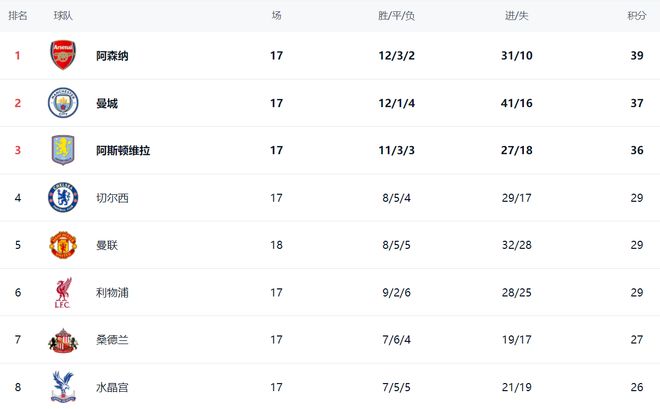 這場(chǎng)比賽讓英超爭(zhēng)四格局大亂。3大豪門積分相同,切爾西、曼聯(lián)和利物浦都是29分。切爾西擁有凈勝球的優(yōu)勢(shì),排名第4。曼聯(lián)則升到第5名。利物浦凈勝球最少,掉到第6名。不過(guò),曼聯(lián)比切爾西和利物浦多踢1場(chǎng),第5的位置并不穩(wěn)固。