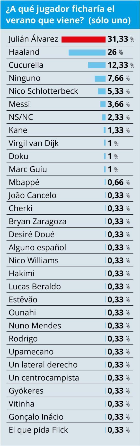 現(xiàn)效力于馬德里競技的阿根廷前鋒阿爾瓦雷斯以31.33%的得票率高居榜首,成為巴薩會(huì)員最希望簽下的球員。這位射手得票率比第二名哈蘭德高出超5個(gè)百分點(diǎn),哈蘭德的支持率為26%。